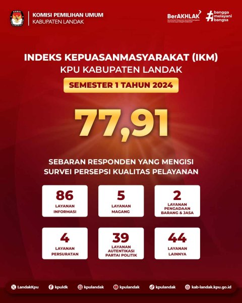 Komisi Pemilihan Umum (KPU) Kabupaten Landak telah melaksanakan Survei Persepsi Kualitas Pelayanan Publik untuk Semester I Tahun 2024. Hasil survei menunjukkan bahwa Indeks Kepuasan Masyarakat (IKM) berada pada angka 77,91, yang mencerminkan tingkat kepuasan masyarakat terhadap pelayanan yang diberikan oleh KPU Kabupaten Landak berada dalam kategori "Baik". Capaian ini merupakan cerminan dari komitmen KPU dalam memberikan layanan publik yang transparan, akuntabel, dan responsif terhadap kebutuhan masyarakat.