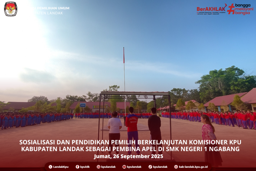 #TemanPemilih, Komisi Pemilihan Umum (KPU) Kabupaten Landak melaksanakan Sosialisasi Pendidikan Demokrasi kepada Pemilih Pemula dengan menjadi Pembina Apel di SMK Negeri 1 Ngabang, Kadiv Sosdiklih Parmas dan SDM Helena Sumanti, Jumat (26/9).
