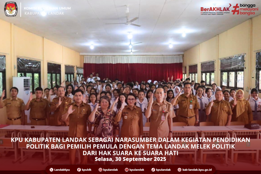 Ngabang, 30 September 2025 — Komisi Pemilihan Umum (KPU) Kabupaten Landak Helena Sumanti Ketua Divisi Sosdiklih Parmas dan SDM hadir sebagai narasumber dalam kegiatan Pendidikan Politik bagi Pemilih Pemula yang diselenggarakan oleh Kesatuan Bangsa dan Politik (Kesbangpol) Kabupaten Landak, Selasa (30/9). Kegiatan ini berlangsung di Aula SMKN 1 Ngabang dan mengusung tema “Landak Melek Politik dari Hak Suara ke Suara Hati.”