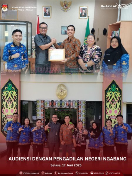 #TemanPemilih - Ketua dan Anggota Komisi Pemilihan Umum Kabupaten Landak melaksanakan audiensi dengan Pegadilan Negeri Ngabang sebagai bentuk silaturahmi dan penyampaian Apresiasi atas dukungan sinergitas menyukseskan tahapan Pemilihan Gubernur dan Wakil Gubernur Kalimantan Barat, Bupati dan Wakil Bupati Landak Tahun 2024. Selasa, 17 Juni 2025.