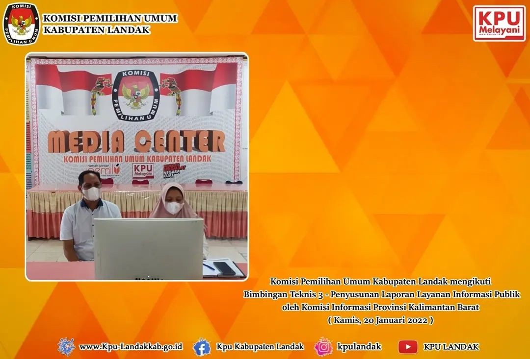 Komisi Pemilihan Umum Kabupaten Landak pada hari Kamis 20 Januari 2022 mengikuti Bimbingan Teknis 3 - Penyusunan Laporan Layanan informasi publik berdasarkan Perki No 1 Tahun 2021 kegiatan ini di ikuti Anggota KPU Kabupaten Landak Divisi Sosialisasi, Pendidikan Pemilih, Partisipasi Masyarakat, dan SDM beserta Kasubbag Teknis Hupmas melalui zoom meeting.