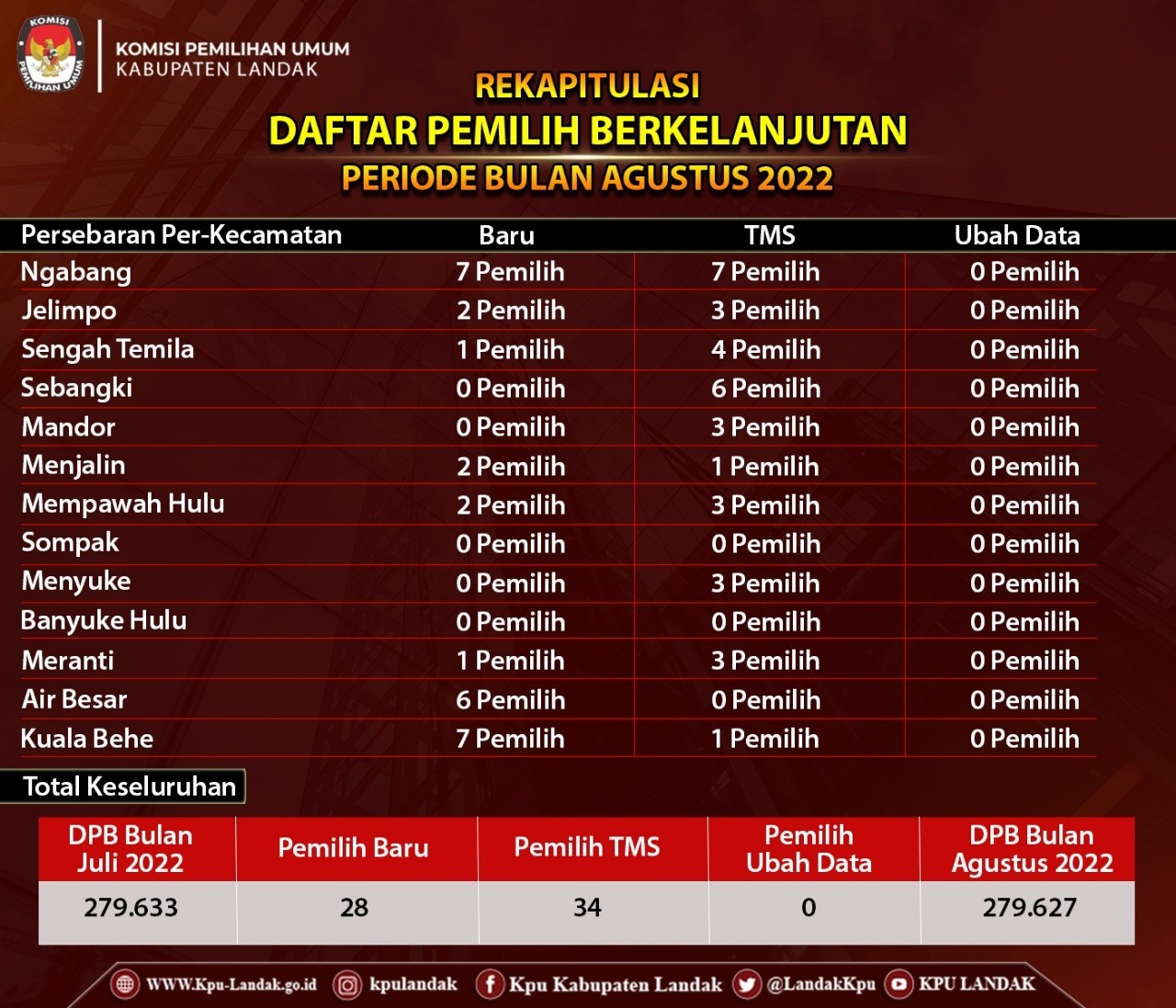 Pada hari Rabu, 31 Agustus 2022 bertempat di kantor Komisi Pemilihan Umum Kabupaten Landak telah dilaksanakan Rekapitulasi Daftar Pemilih Berkelanjutan Periode Bulan Agustus Tahun 2022.Berikut adalah Infografis pemutakhiran DPB Kabupaten Landak Periode bulan Agustus Tahun 2022.