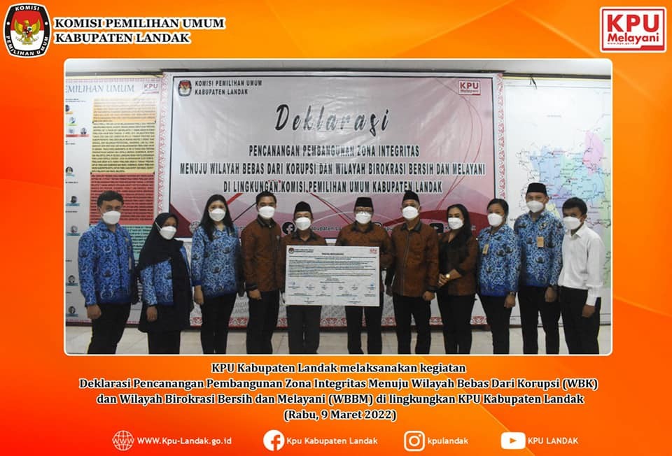 Rabu tanggal 9 Maret 2022 KPU Kabupaten Landak bertempat di Aula KPU Kabupaten Landak melaksanakan kegiatan Deklarasi Pencanangan Pembangunan Zona Integritas Menuju Wilayah Bebas Dari Korupsi (WBK) dan Wilayah Birokrasi Bersih dan Melayani (WBBM) di lingkungakan KPU Kabupaten Landak.