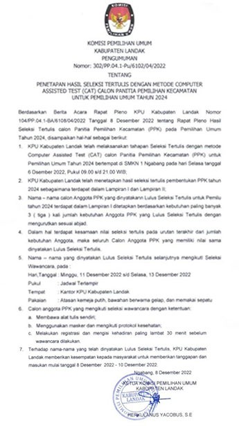 Berdasarkan Berita Acara Rapat Pleno KPU Kabupaten Landak Nomor: 302/PP.04.1-Pu/6102/04/2022 tentang Rapat Pleno Penetapan Hasil Seleksi Tertulis Panitia Pemilihan Kecamatan untuk Pemilu Tahun 2024, disampaikan hal-hal sebagai berikut: