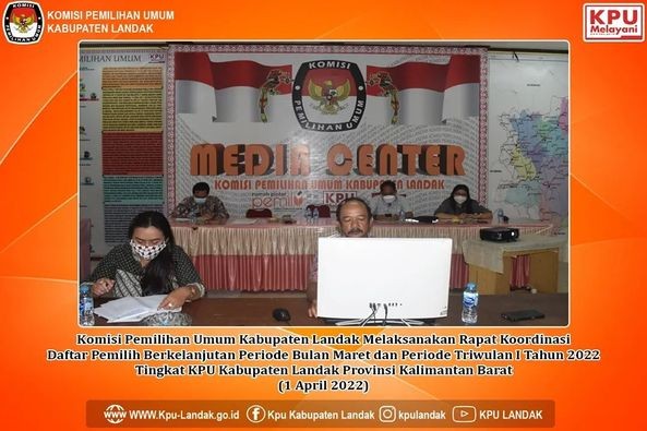 Jumat, 1 April 2022. Bertempat di aula Kantor Komisi Pemilihan Umum Kabupaten Landak melaksanakan Rapat Koordinasi Daftar Pemilih Berkelanjutan Periode Bulan Maret dan Periode Triwulan I Tahun 2022 secara daring melalui Aplikasi Google Meeting. Adapun peserta Rapat Koordinasi ini, yaitu : Bawaslu Kabupaten Landak, Kodim 1201/ Mempawah, Polres Landak, Parpol.