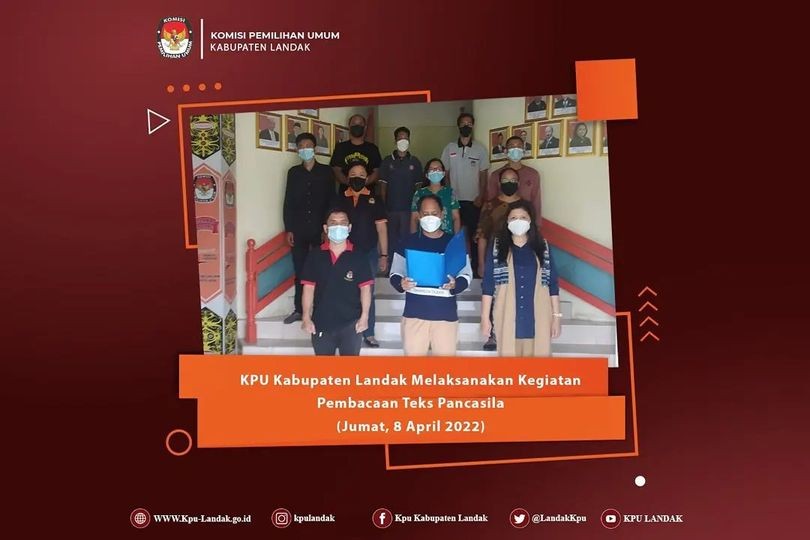 Jumat, 8 April 2022. Komisi Pemilihan Umum melaksanakan Kegiatan Pembacaan Teks Pancasila. Kegiatan ini dipimpin oleh Bapak M. Tarmizi selaku Komisioner Komisi Pemilihan Umum Kabupaten Landak.