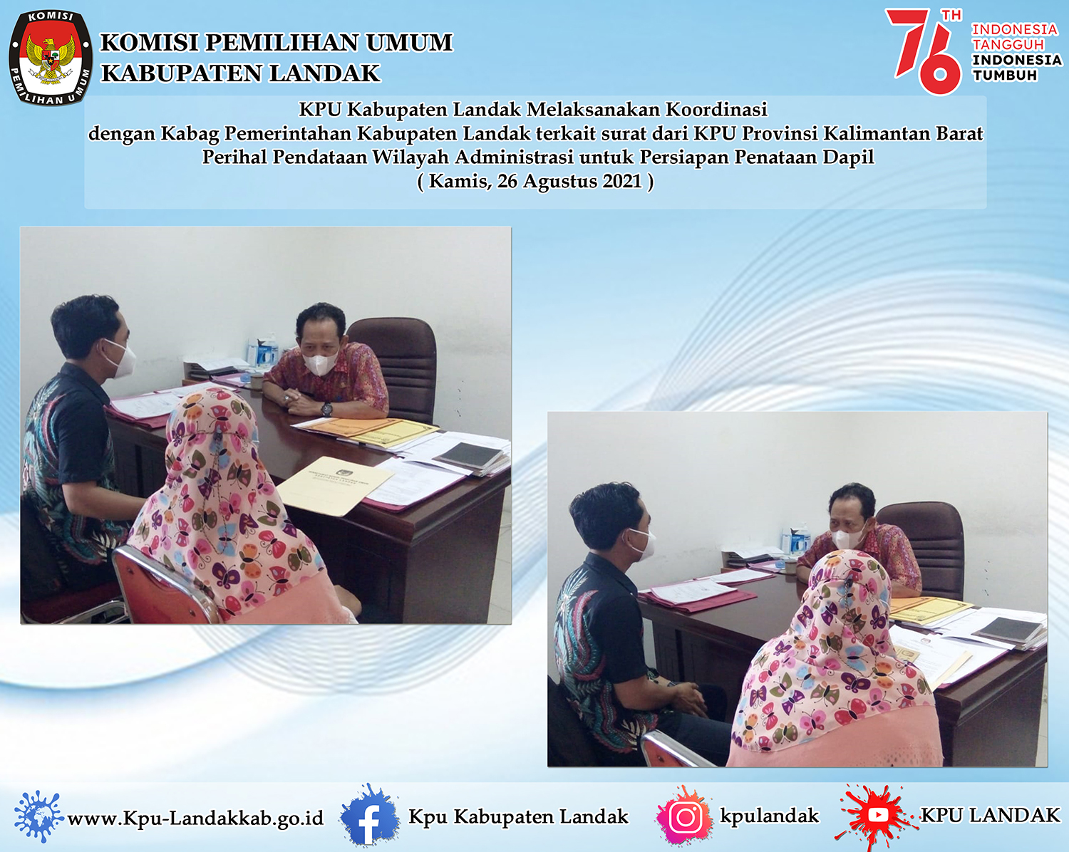 Koordinasi dengan Kabag Pemerintahan Kabupaten Landak terkait surat dari KPU Provinsi Kalimantan Barat Perihal Pendataan Wilayah Administrasi untuk Persiapan Penataan Dapil.