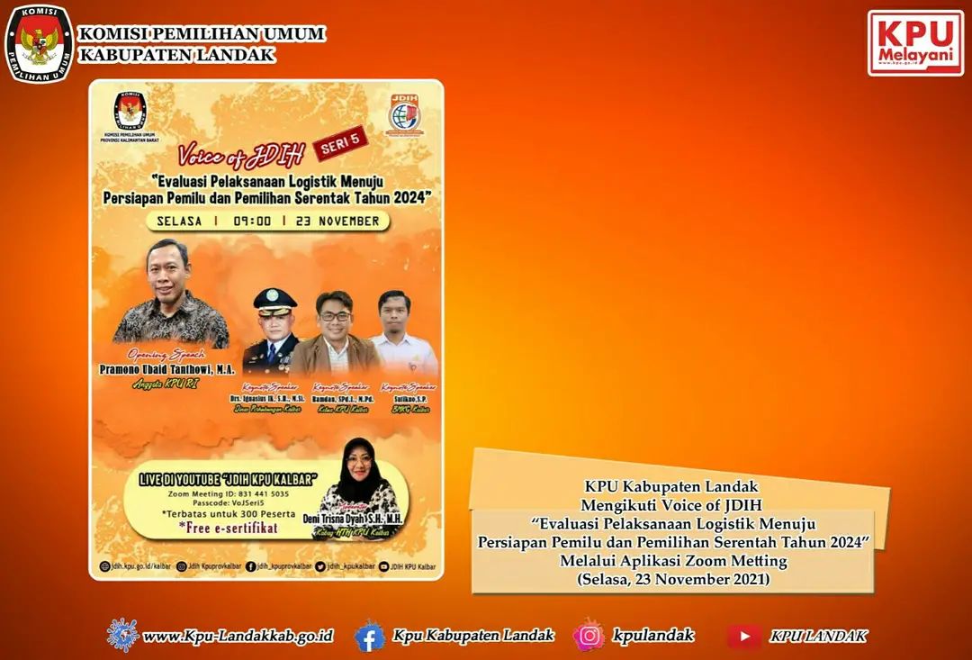 KPU Kabupaten Landak Mengikuti Kegiatan Voice of JDIH "Evaluasi Pelaksanaan Logistik Menuju Persiapan Pemilu dan Pemilihan Serentak Tahun 2024", melalui Aplikasi Zoom Meeting.