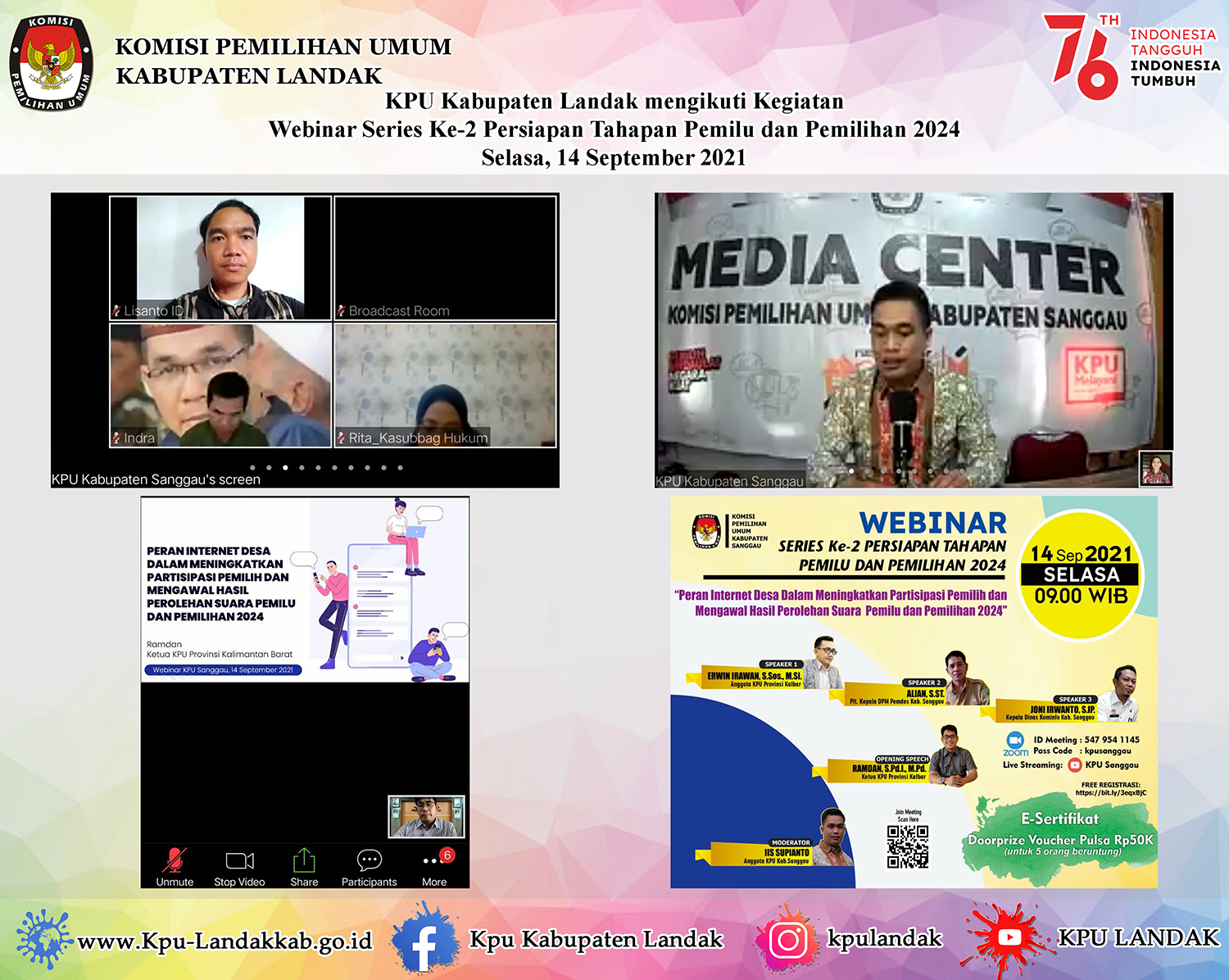 KPU Kabupaten Landak mengikuti Kegiatan Webinar Series Ke-2 Persiapan Tahapan Pemilu dan Pemilihan 2024. Selasa, 14 September 2021, dengan judul Peran Internet Desa Dalam Meningkatkan Partisipasi Pemilih dan Mengawal Hasil Perolehan Suara Pemilu dan Pemilihan 2024. Kegiatan ini diikuti oleh Bapak Lisanto selaku Komisioner Divisi Teknis Penyelenggaran KPU Kabupaten Landak.