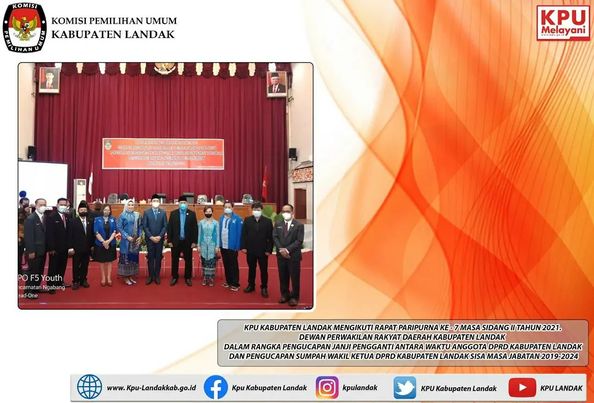 KPU KABUPATEN LANDAK MENGIKUTI RAPAT PARIPURNA KE - 7 MASA SIDANG II TAHUN 2021. DEWAN PERWAKILAN RAKYAT DAERAH KABUPATEN LANDAK DALAM RANGKA PENGUCAPAN JANJI PENGGANTI ANTARA WAKTU ANGGOTA DPRD KABUPATEN LANDAK DAN PENGUCAPAN SUMPAH WAKIL KETUA DPRD KABUPATEN LANDAK SISA MASA JABATAN 2019-2024.
