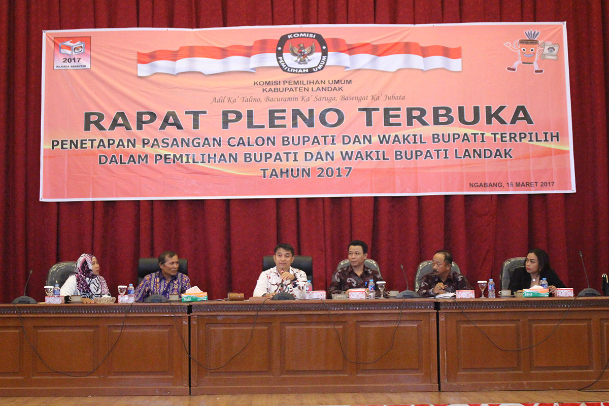 NGABANG - Komisi Pemilihan Umum Kabupaten Landak, Kamis (16/3) siang menggelar rapat pleno terbuka penetapan pasangan calon bupati dan wakil bupati terpilih pada Pilkada Landak 2017 yaitu dr. Karolin Margret Natasa dan Herculanus Heriadi, S.E.