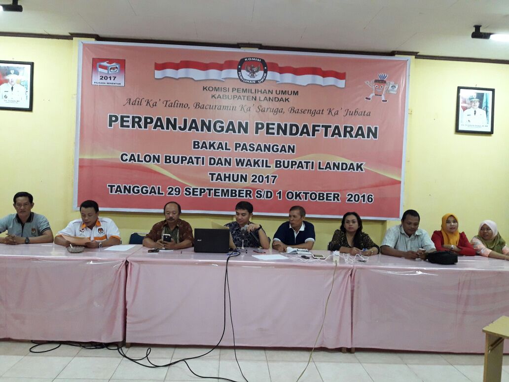 Sampai dengan batas waktu perpanjangan pendaftaran pada hari terakhir tanggal 1 Oktober 2016 jam 24.00 WIB tidak ada Bakal Pasangan Calon Bupati dan wakil Bupati Landak Tahun 2017 yang mendaftar. Demikian disampaikan Ketua KPU Landak Lomon saat membacakan hasil Rapat Pleno dengan agenda Penutupan Perpanjangan Pendaftaran Pemilihan Bupati dan Wakil Bupati Landak Tahun 2017 di Aula KPU Landak. Rapat Pleno dihadiri oleh seluruh Komisioner, Sekretaris dan Para Kasubag serta Ketua Panwaslih Kabupaten Landak.