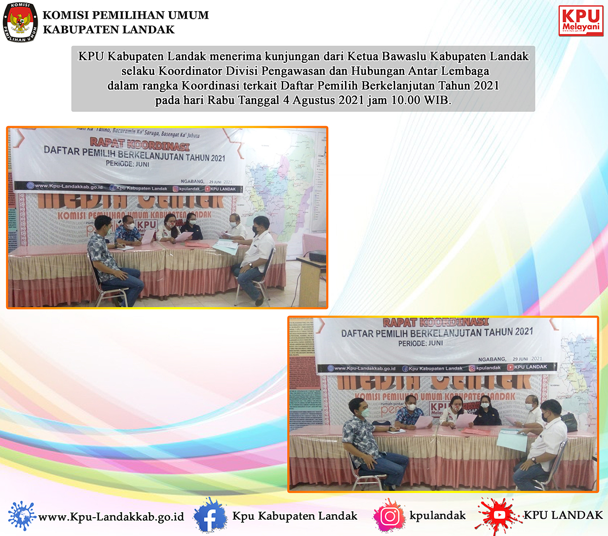 Pada Hari Rabu Tanggal 4 Agustus 2021 Pukul 10.00 WIB Komisi Pemilihan Umum (KPU) Kabupaten Landak menerima kunjungan dari Ketua Bawaslu Kabupaten Landak sekaligus Koordinator Divisi Pengawasan dan Hubungan Antar Lembaga yaitu Bapak Drs. Petrus Kanisius Ng dalam rangka Koordinasi terkait Daftar Pemilih Berkelanjutan (DPB) Tahun 2021 sesuai Surat Edaran Bawaslu RI Nomor 13 Tahun 2021 Tentang Pengawasan DPB.
