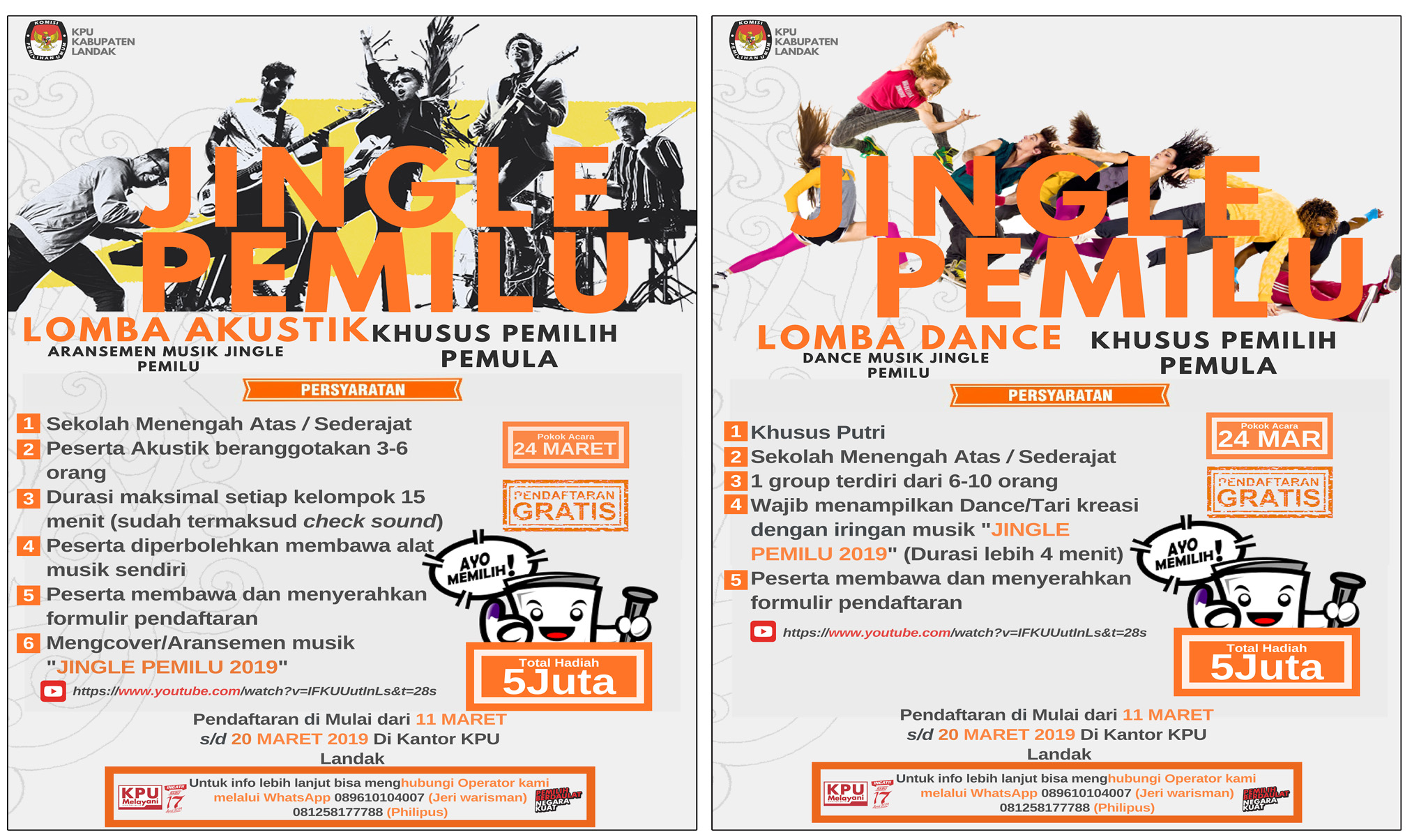 Ayo segera daftarkan diri anda ,dalam acara Lomba JINGLE PEMILU 2019 yang akan dilaksanakan di Kantor KPU kabupaten landak