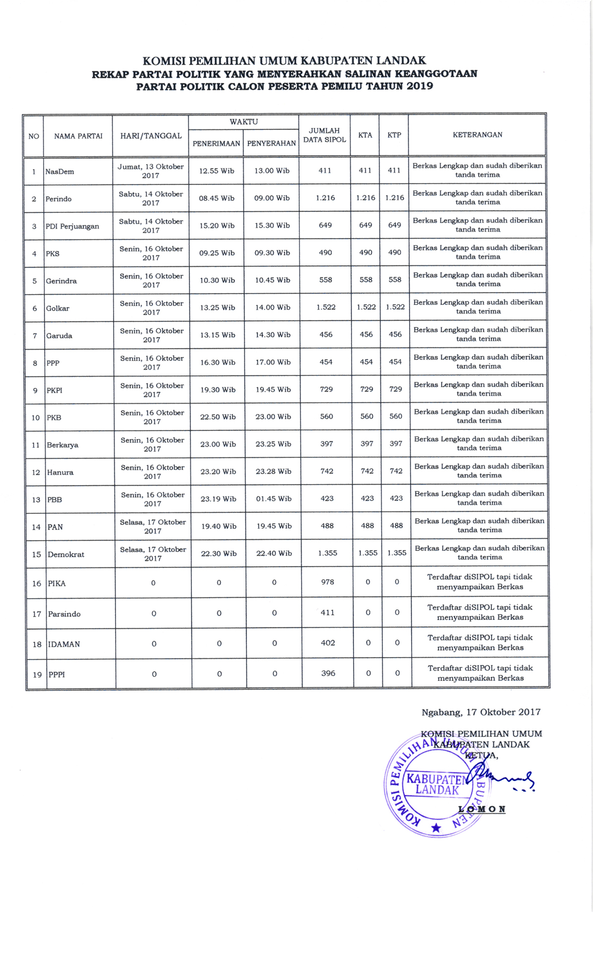 Partai Politik yang menyerahkan Salinan Keanggotaan Parpol Calon Peserta Pemilu Tahun 2019