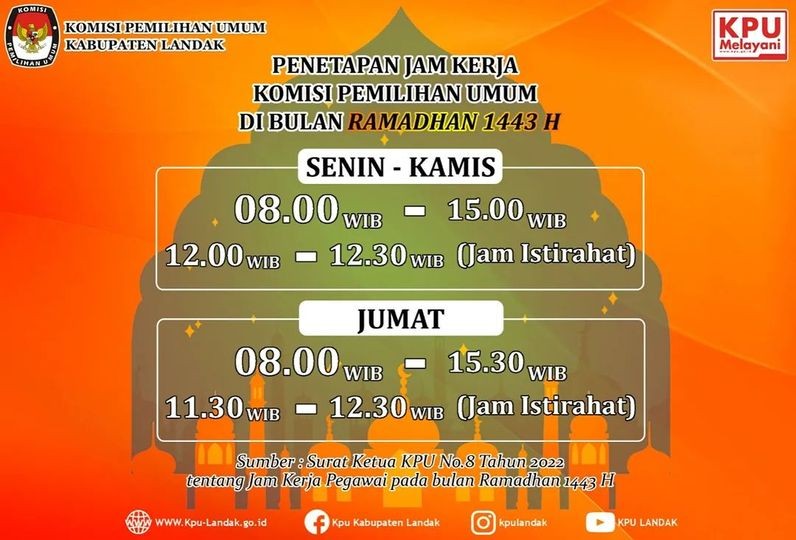 Berikut merupakan Penetapan Jam Kerja Komisi Pemilihan Umum di Bulan Ramadhan 1443 H.