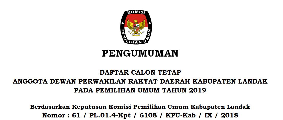 Pengumuman Penetapan Daftar Calon Tetap Anggota Dewan Perwakilan Daerah Kabupaten Landak pada Pemilihan Umum Tahun 2019.