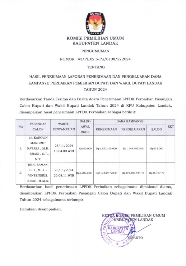 PENGUMUMAN HASIL PENERIMAAN LPPDK PEMILIHAN BUPATI DAN WAKIL BUPATI LANDAK TAHUN 2024