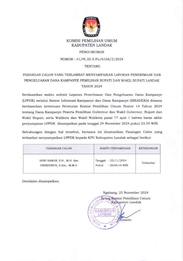 PENGUMUMAN PASANGAN CALON YANG TERLAMBAT MENYAMPAIKAN LPPDK PEMILIHAN BUPATI DAN WAKIL BUPATI LANDAK TAHUN 2024