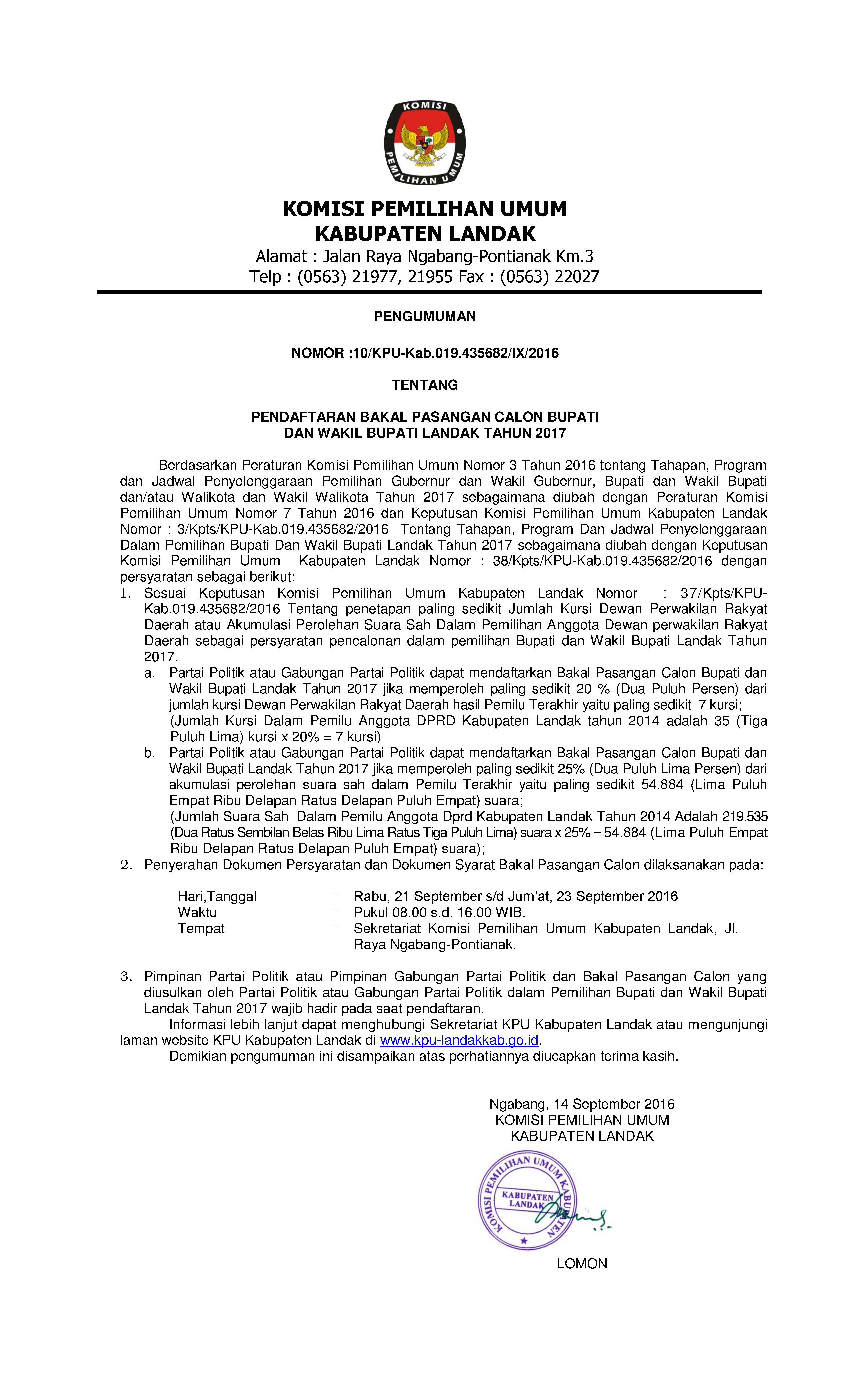 PENGUMUMAN PENDAFTARAN BAKAL PASANGAN CALON BUPATI DAN WAKIL BUPATI LANDAK TAHUN 2017