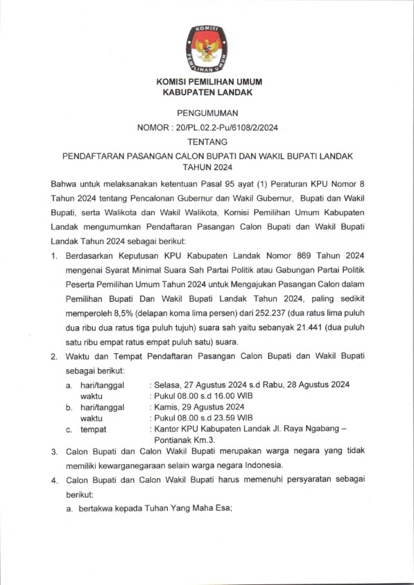 Berikut disampaikan Pengumuman Nomor : NOMOR: 20/PL.02.2-Pu/6108/2024 tentang Pendaftaran Pasangan Calon Bupati dan Wakil Bupati Landak Tahun 2024.