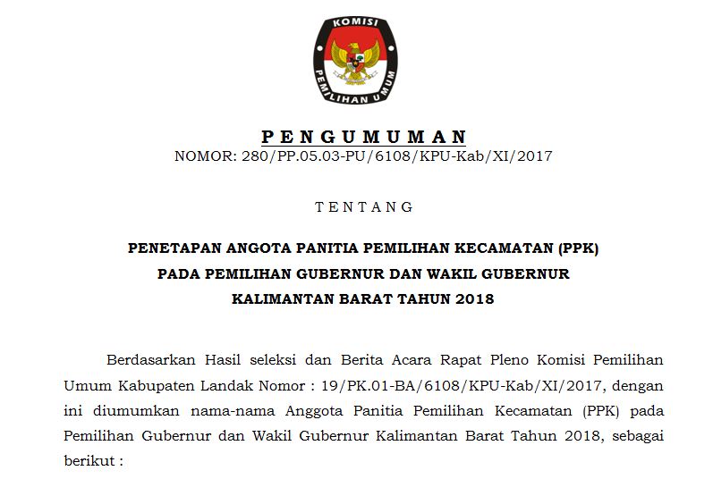 Berdasarkan Hasil seleksi dan Berita Acara Rapat Pleno Komisi Pemilihan Umum Kabupaten Landak Nomor : 19/PK.01-BA/6108/KPU-Kab/XI/2017, dengan ini diumumkan nama-nama Anggota Panitia Pemilihan Kecamatan (PPK) pada Pemilihan Gubernur dan Wakil Gubernur Kalimantan Barat Tahun 2018.