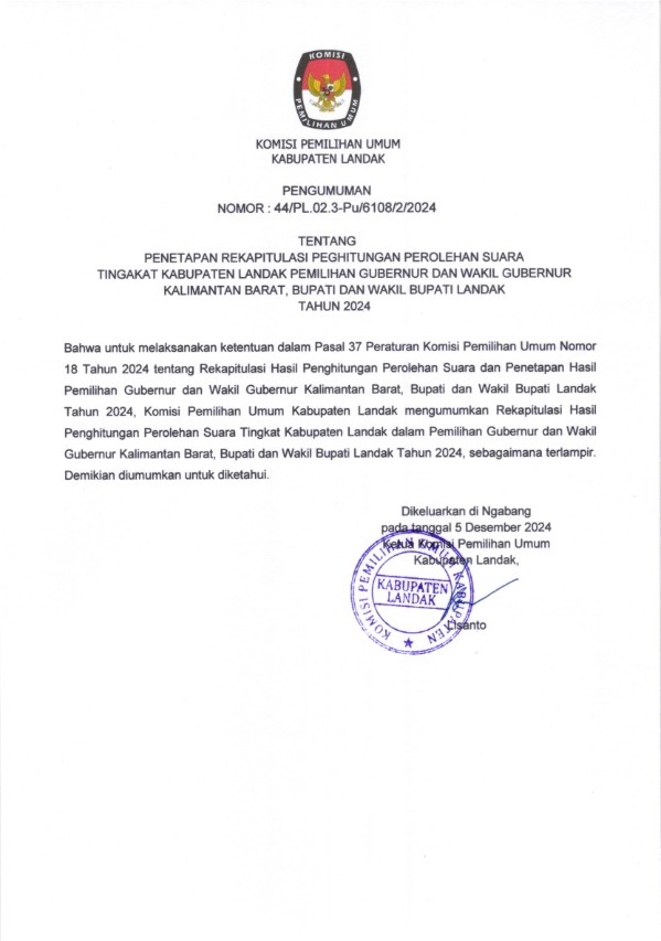 Bahwa untuk melaksanakan ketentuan dalam Pasal 37 Peraturan Komisi Pemilihan Umum Nomor 18 Tahun 2024 tentang Rekapitulasi Hasil Penghitungan Perolehan Suara dan Penetapan Hasil Pemilihan Gubernur dan Wakil Gubernur Kalimantan Barat, Bupati dan Wakil Bupati Landak Tahun 2024, Komisi Pemilihan Umum Kabupaten Landak mengumumkan Rekapitulasi Hasil Penghitungan Perolehan Suara Tingkat Kabupaten Landak dalam Pemilihan Gubernur dan Wakil Gubernur Kalimantan Barat, Bupati dan Wakil Bupati Landak Tahun 2024. Dokumen Pengumuman dan SK Penetapan Hasil Pemilihan Bupati dan Wakil Bupati Landak Tahun 2024 dapat diunduh dibawah ini: