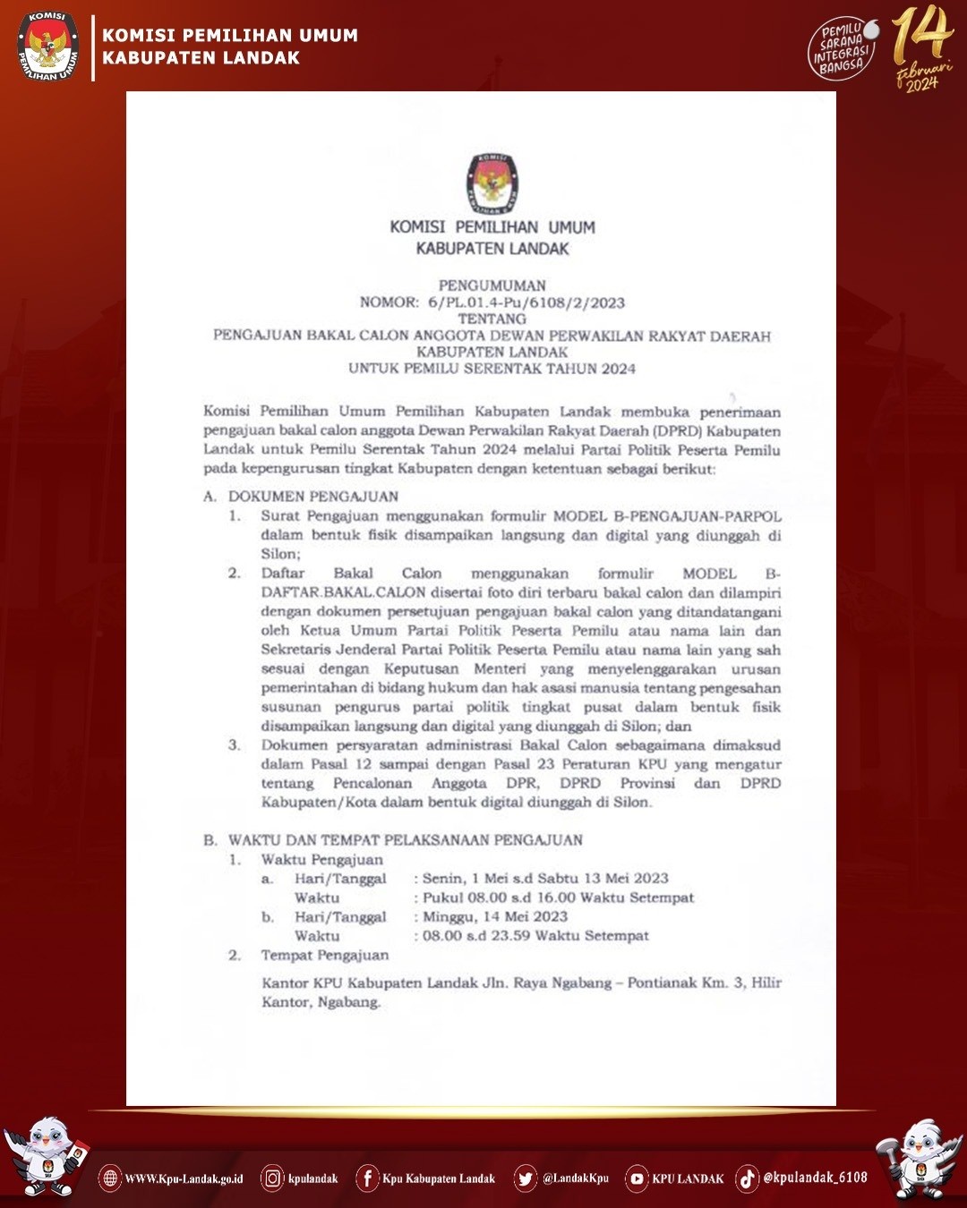 Berikut Pengumuman Pengajuan Bakal Calon Anggota Dewan Perwakilan Rakyat Daerah (DPRD) Kabupaten Landak untuk Pemilihan Umum Serentak Tahun 2024.