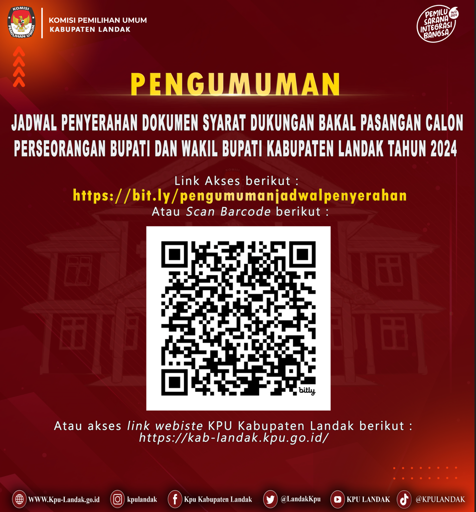 Berikut disampaikan Pengumuman Nomor : 8/PL.02.2-Pu/6108/2/2024 tentang Penyerahan Dokumen Dukungan Pencalonan Perseorangan Bakal Pasangan Calon Bupati dan Wakil Bupati Kabupaten Landak Tahun 2024.