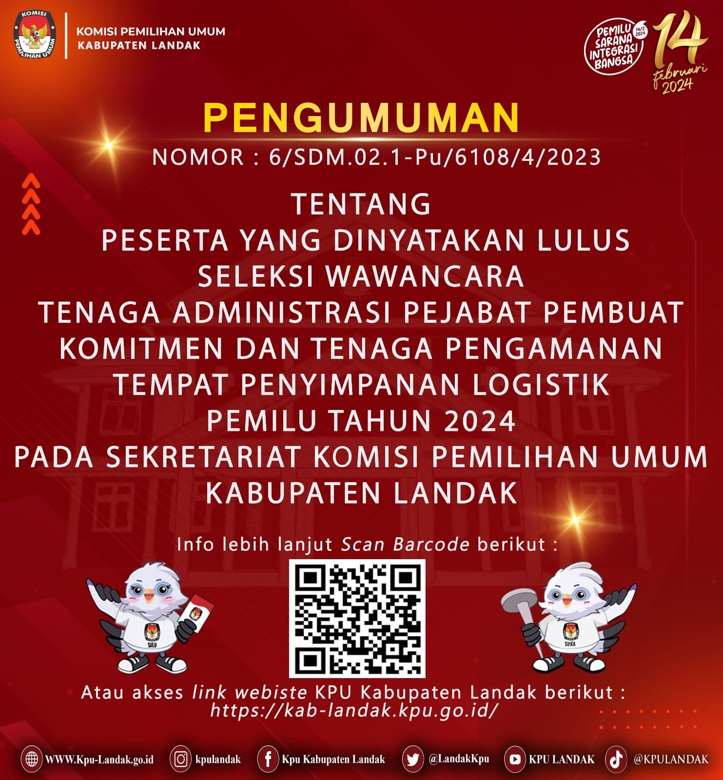 Berdasarkan Berita Acara Nomor: 11/SDM.02.1-BA/6108/2023 tentang Penetapan Hasil Wawancara Tenaga Administrasi Pejabat Pembuat Komitmen dan Tenaga Pengamanan Tempat Penyimpanan Logistik Pemilu Tahun 2024 Pada Sekretariat Komisi Pemilihan Umum Kabupaten Landak.