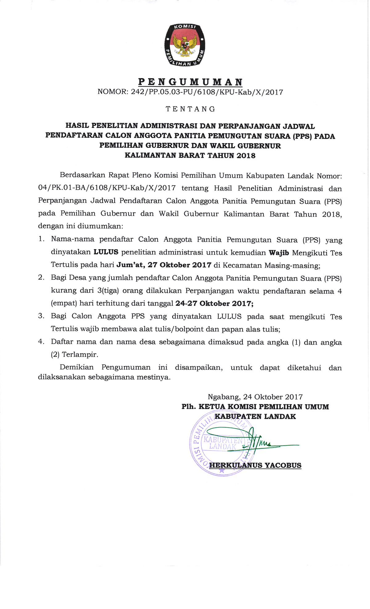 Pengumuman Hasil Penelitian Administrasi dan Perpanjangan Pendaftaran Calon Anggota Pemungutan Suara (PPS) Pada Pemilihan Gubernur dan Wakil Gubernur Kalimantan Barat Tahun 2017.