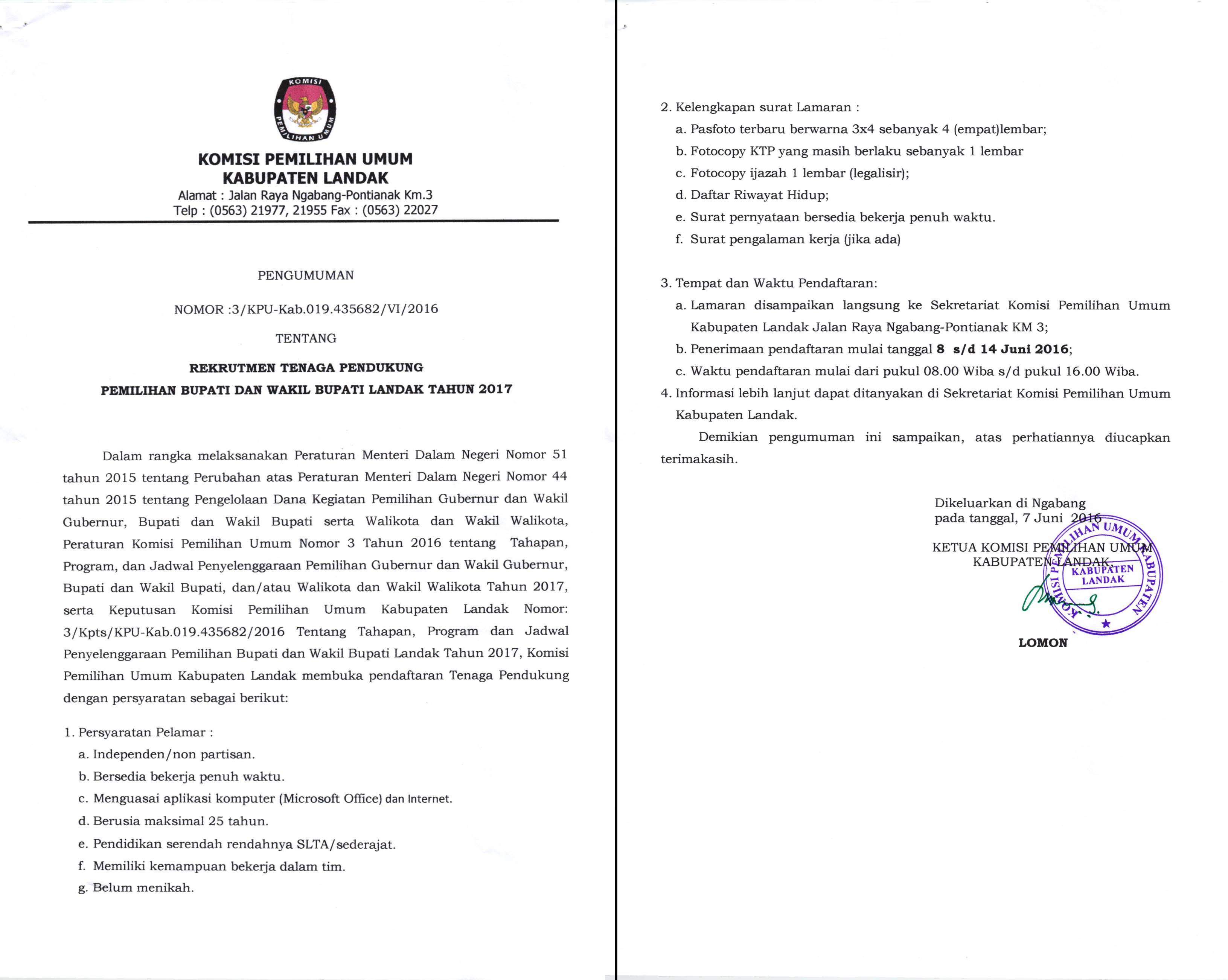 PENGUMUMAN REKRUITMEN TENAGA PENDUKUNG PEMILIHAN BUPATI DAN WAKIL BUPATI LANDAK TAHUN 2017
