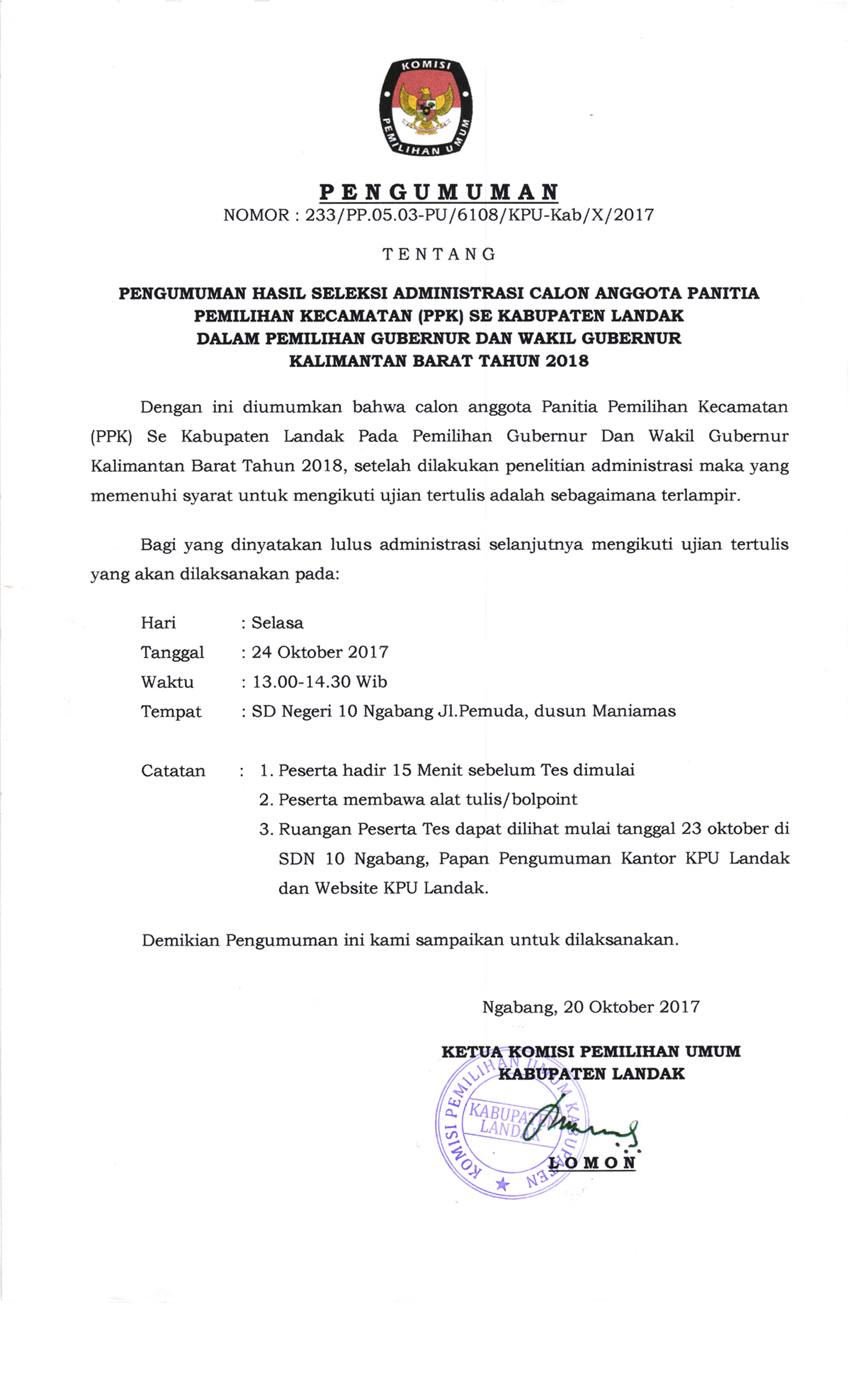Dengan ini diumumkan bahwa calon anggota Panitia Pemilihan Kecamatan (PPK) Se Kabupaten Landak Pada Pemilihan Gubernur Dan Wakil Gubernur Kalimantan Barat Tahun 2018, setelah dilakukan penelitian administrasi maka yang memenuhi syarat untuk mengikuti ujian tertulis adalah sebagaimana terlampir.