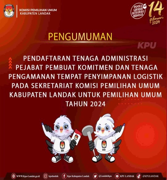 #TemanPemilih, Komisi Pemilihan Umum Kabupaten Landak membuka pendaftaran Tenaga Administrasi Pejabat Pembuat Komitmen dan Tenaga Pengamanan tempat penyimpanan logistik pada Sekretariat KPU Kabupaten Landak pada Pemilihan Umum Tahun 2024.