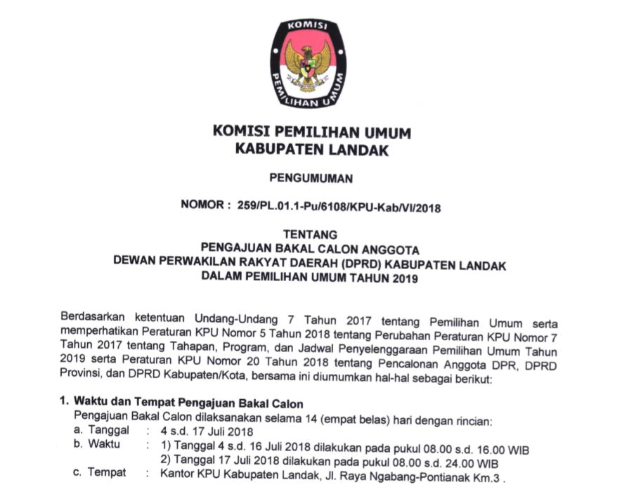 Berikut Pengumuman tentang Pengajuan Bakal Calon Anggota DPRD Kabupaten Landak dalam Pemilihan Umum Tahun 2018.