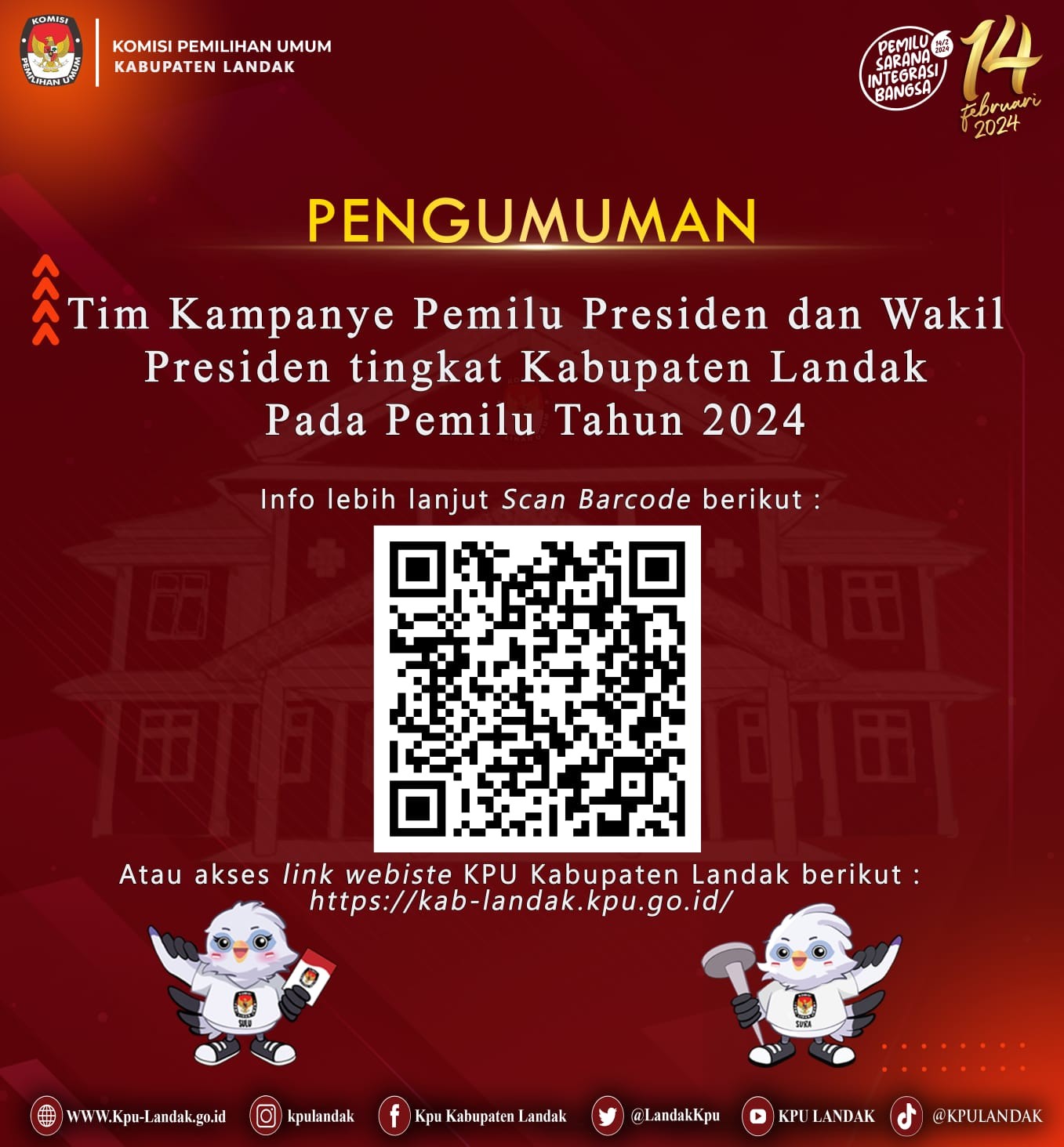 Pengumuman Tim Kampanye Pemilu Presiden dan Wakil Presiden Tingkat Kabupaten Landak pada Pemilu Tahun 2024 sudah bisa kamu akses di website KPU Kabupaten Landak, bisa juga pada link :