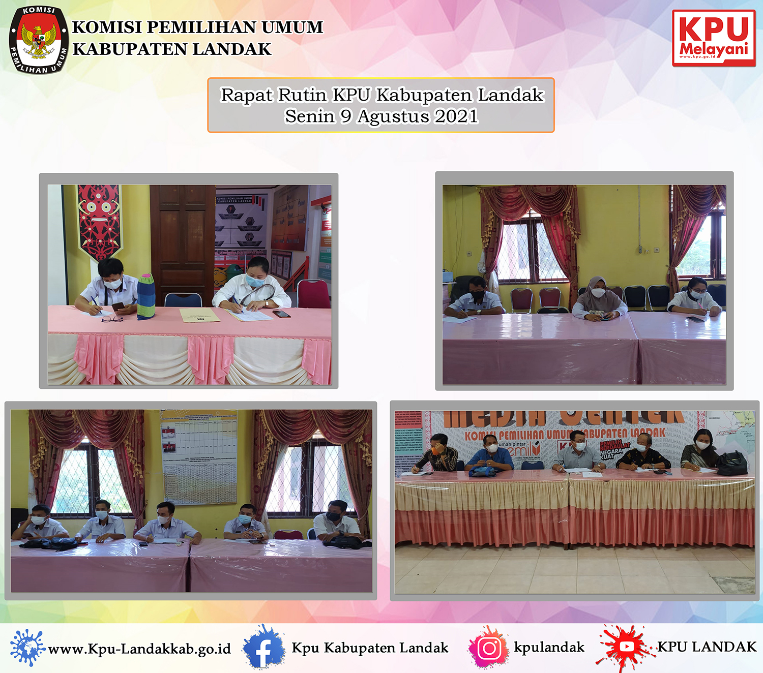Rapat Rutin KPU Kabupaten Landak, Senin 9 Agustus 2021. Dihadiri oleh Ketua KPU, Plt. Sekretaris dan seluruh staf KPU Kabupaten Landak.