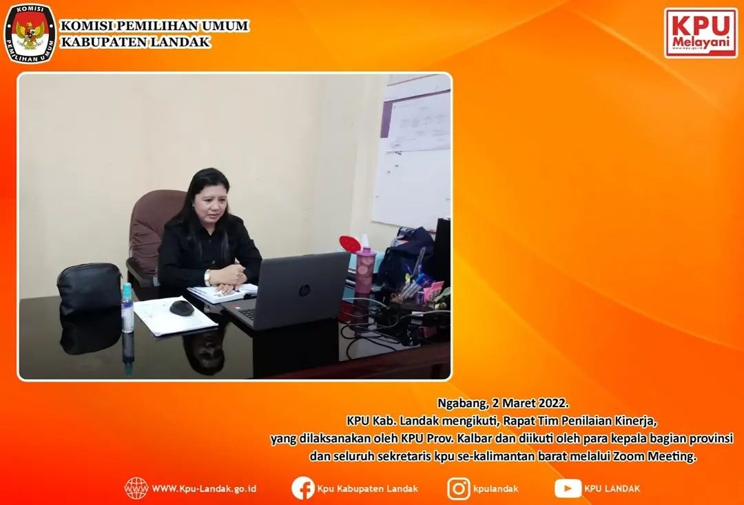 KPU Kab. Landak mengikuti, Rapat Tim Penilaian Kinerja, yang dilaksanakan oleh KPU Prov. Kalbar dan diikuti oleh para kepala bagian provinsi dan seluruh sekretaris kpu se-kalimantan barat melalui Zoom Meeting.