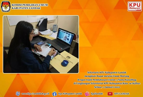 Selasa, 11 Januari 2022 Sekretaris KPU Kabupaten Landak mengikuti Rapat melalui Zoom Meeting dengan topik Pembahasan Usulan 3 Nama Kasubbag di Lingkungan Sekretariat KPU Kabupaten/Kota se-Kalbar. Rapat tersebut diselenggarakn oleh KPU Provinsi Kalbar dengan diikuti oleh Para sekretari KPU Kabupaten/Kota Se-Kalbar.
