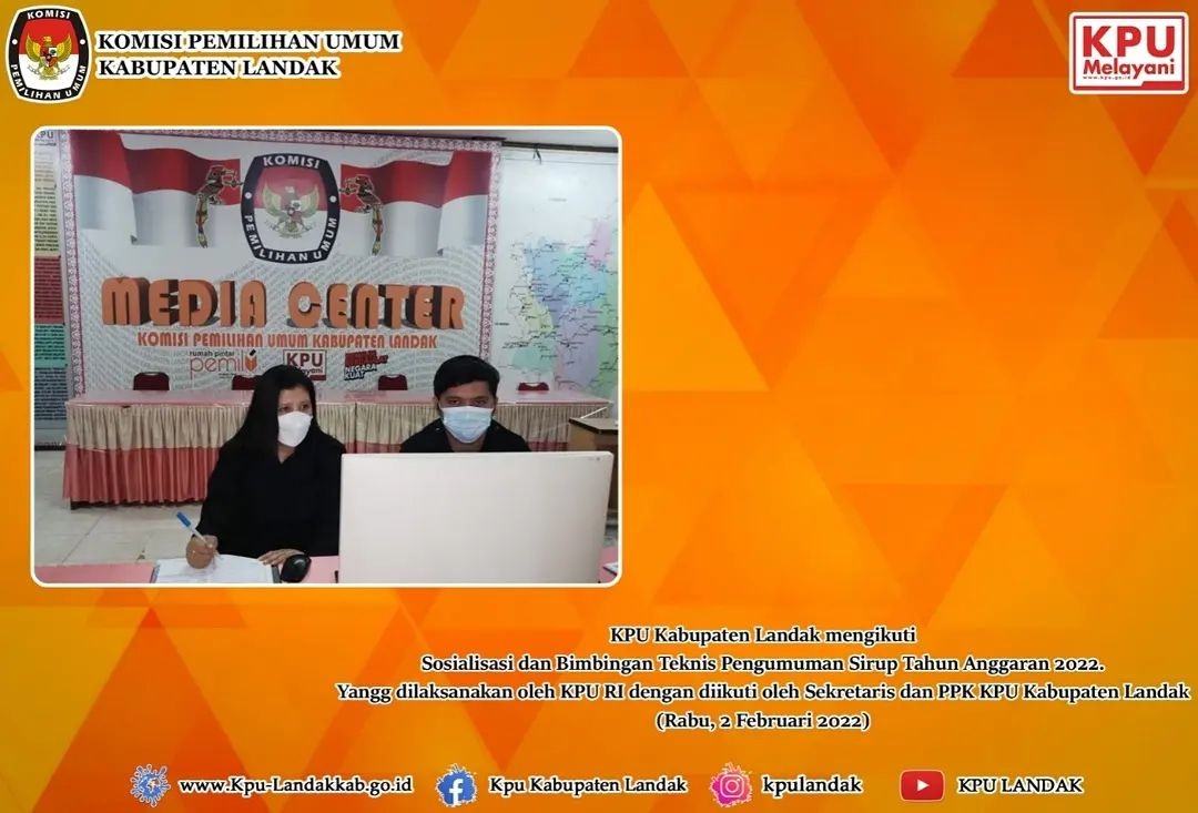 KPU Kabupaten Landak Mengikuti Sosialisasi dan Bimbingan Teknis Pengumuman Sirup Tahun Anggaran 2022. Yang dilaksanakan oleh KPU RI dengan diikuti oleh Sekretaris dan PPK KPU Kabupaten Landak.