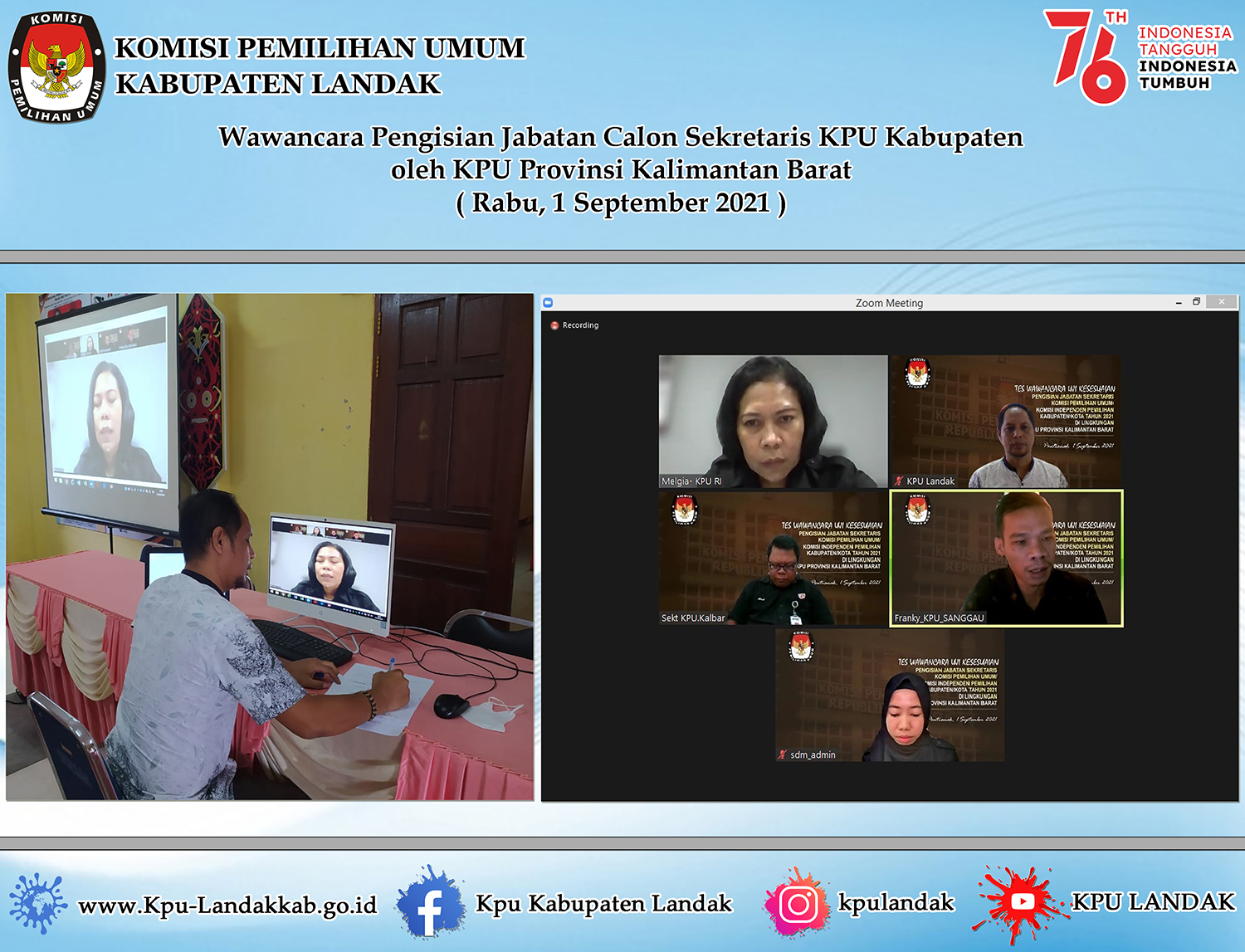 M. Trmizi (Anggota KPU Kabupaten Landak) menjadi Tim Seleksi dalam Kegiatan Tes Wawancara Uji Kesesuaian Pengisian Jabatan Sekretaris Komisi Pemilihan Umum / Komisi Independen Pemilihan Kabupaten/Kota Tahun 2021 di Lingkungan KPU Provinsi Kalimantan Barat melalui Aplikasi Zoom Meeting.